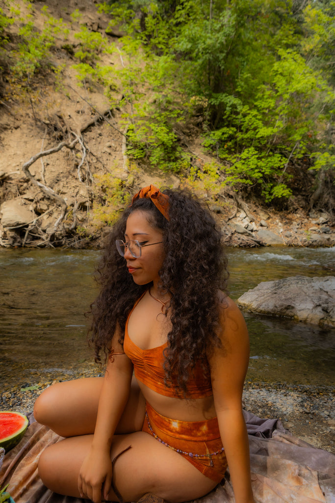 This set comes with three pieces, one Luna bralette, one pair of period panties, and a matching bandana. All made to order in your size and color choices!