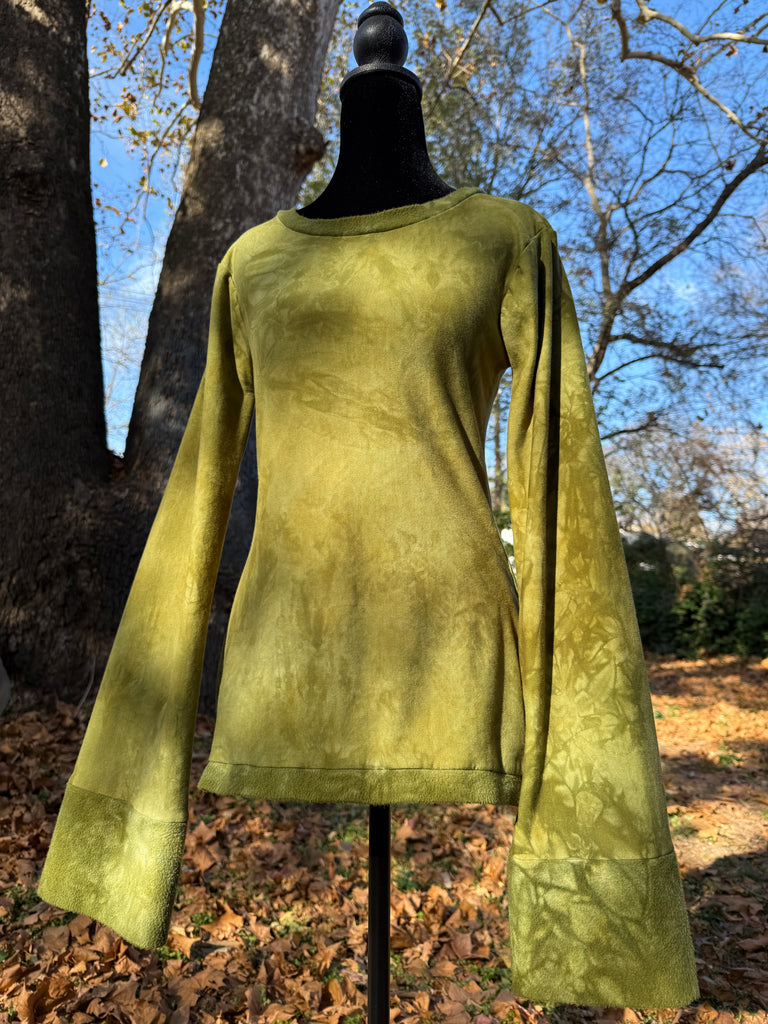 Made with hemp/bamboo blend stretch fleece. Has a wider neckline for comfort, slightly belled sleeves with double layered cuffs for extra warmth, and slight belled bottom hem for comfort and movement: comes in length ranging 24-30”